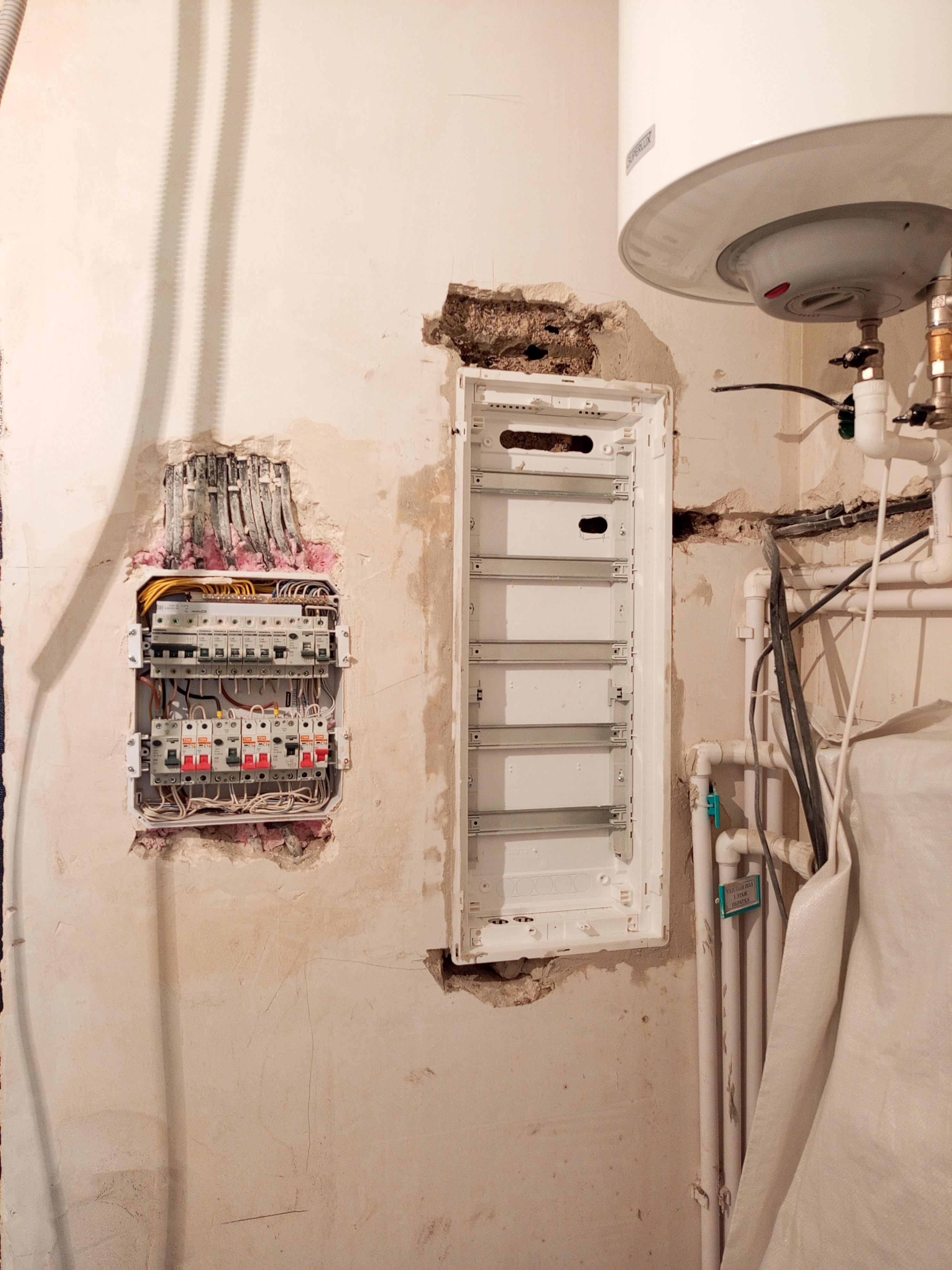 Выполнен перенос и замена электрощита. Установлен пластиковый щит с металлической крышкой EKF NOVA PROxima на 60 модулей.