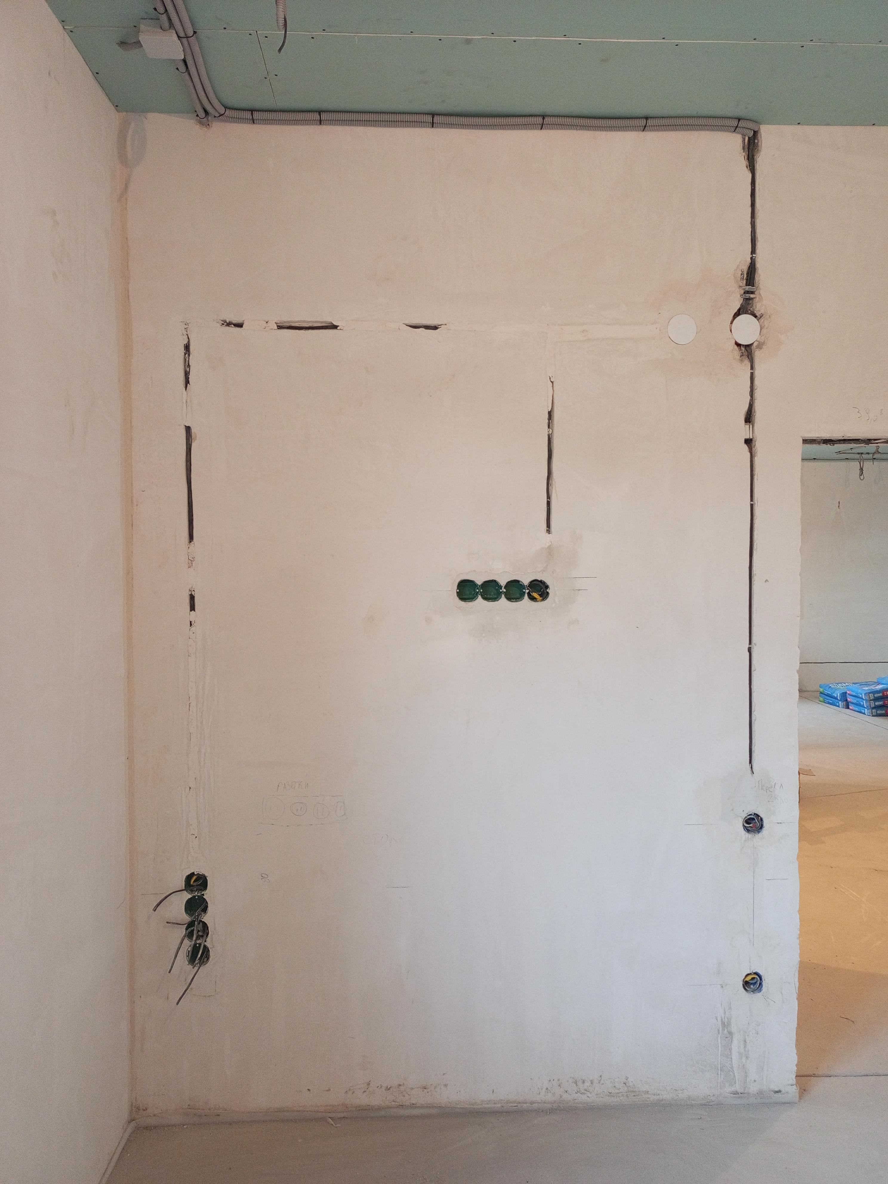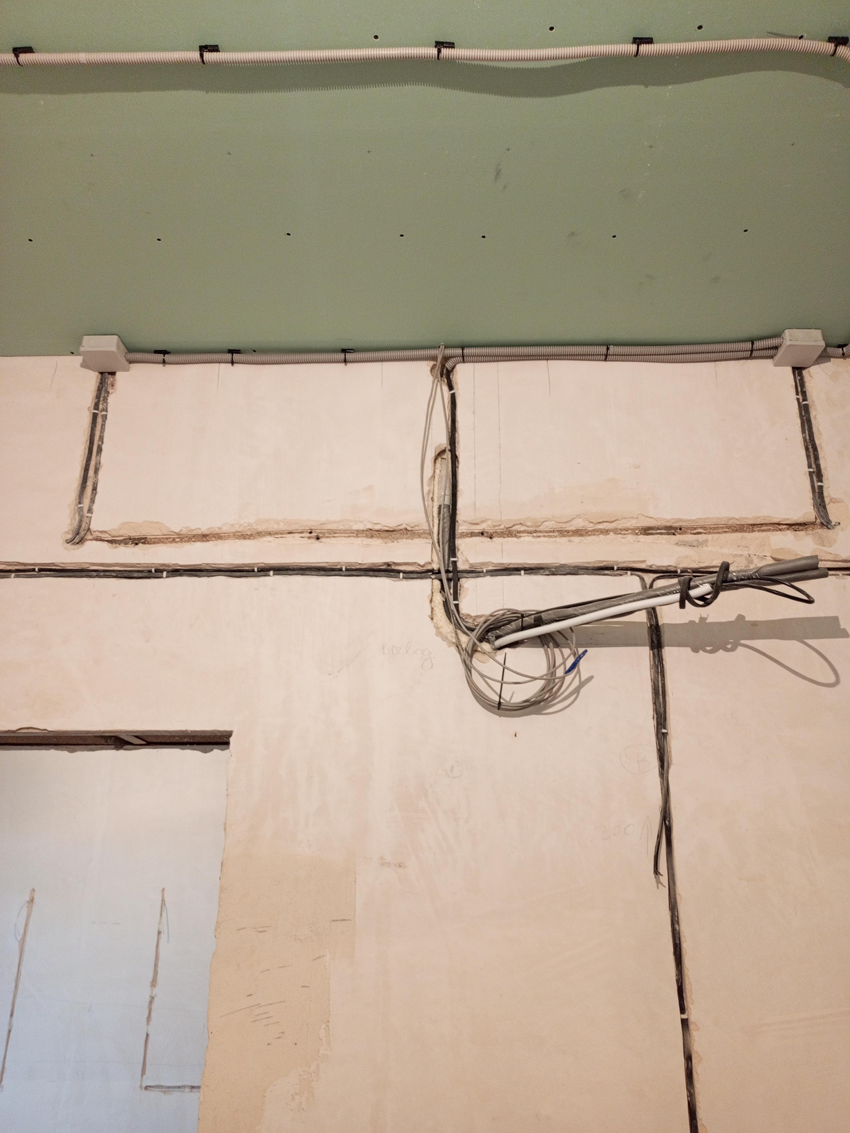 Новые кабельные линии проложили по потолку в гофротрубе с вертикальными спусками в штробах. Максимально сохранена уже имеющаяся проводка, проложенная горизонтально по стенам.