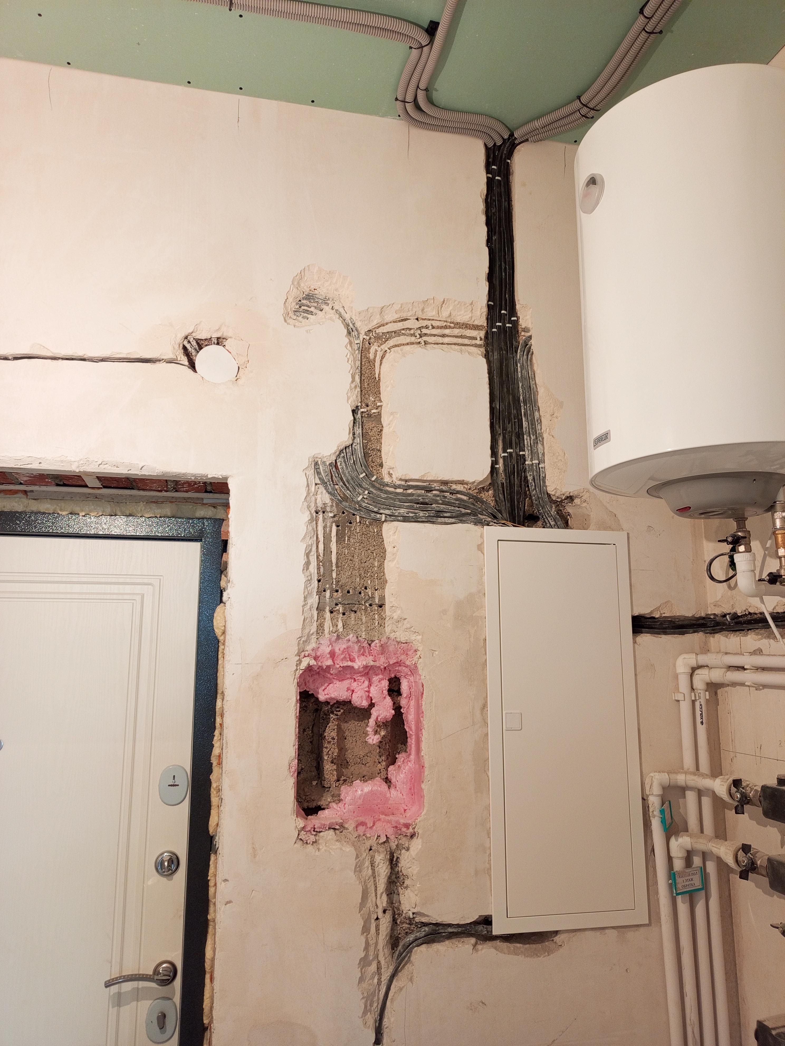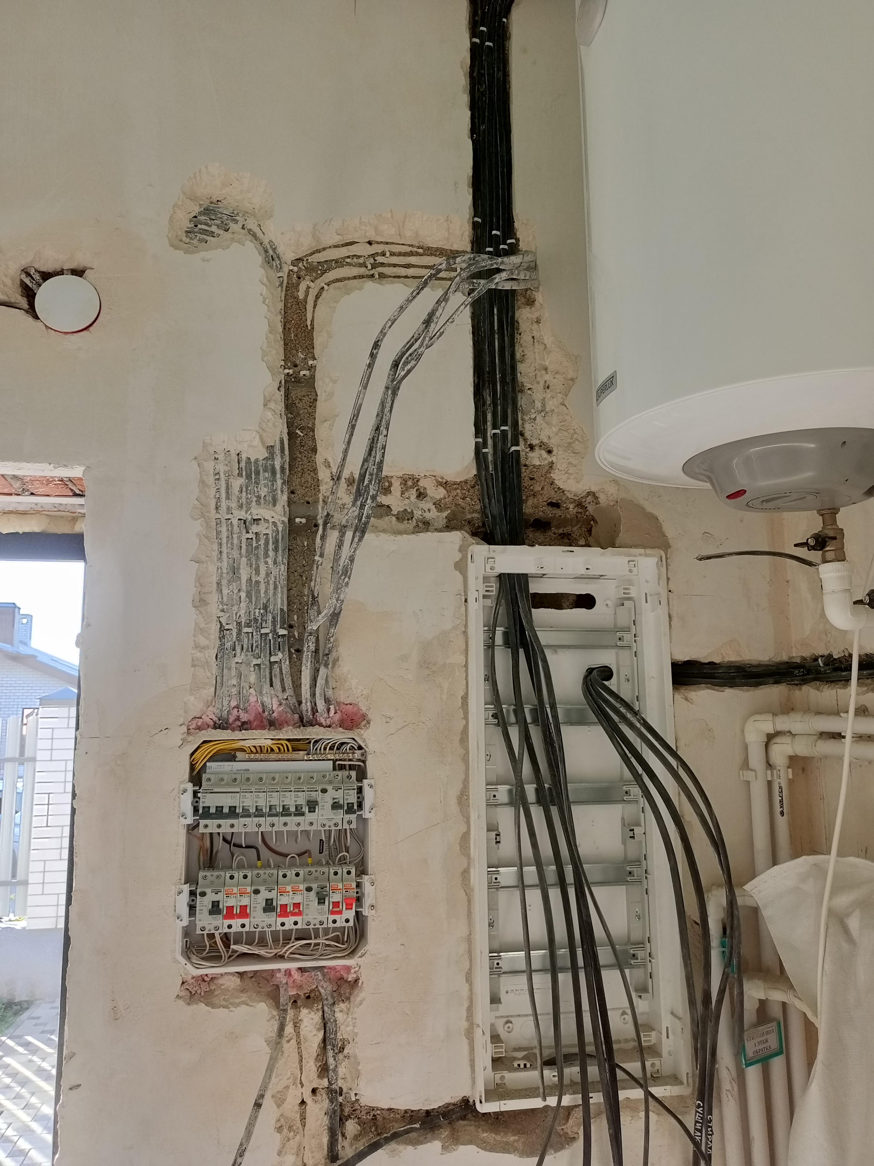Проложено 520м разного кабеля, расключено 30 распредкоробок, врезано 90 подрозетников и 90 м штробы. Предусмотрены стандартные отдельные линии : холодильник, морозильная камера, духовой шкаф, посудомоечная машина, сплит системы, зарядка электромобиля.