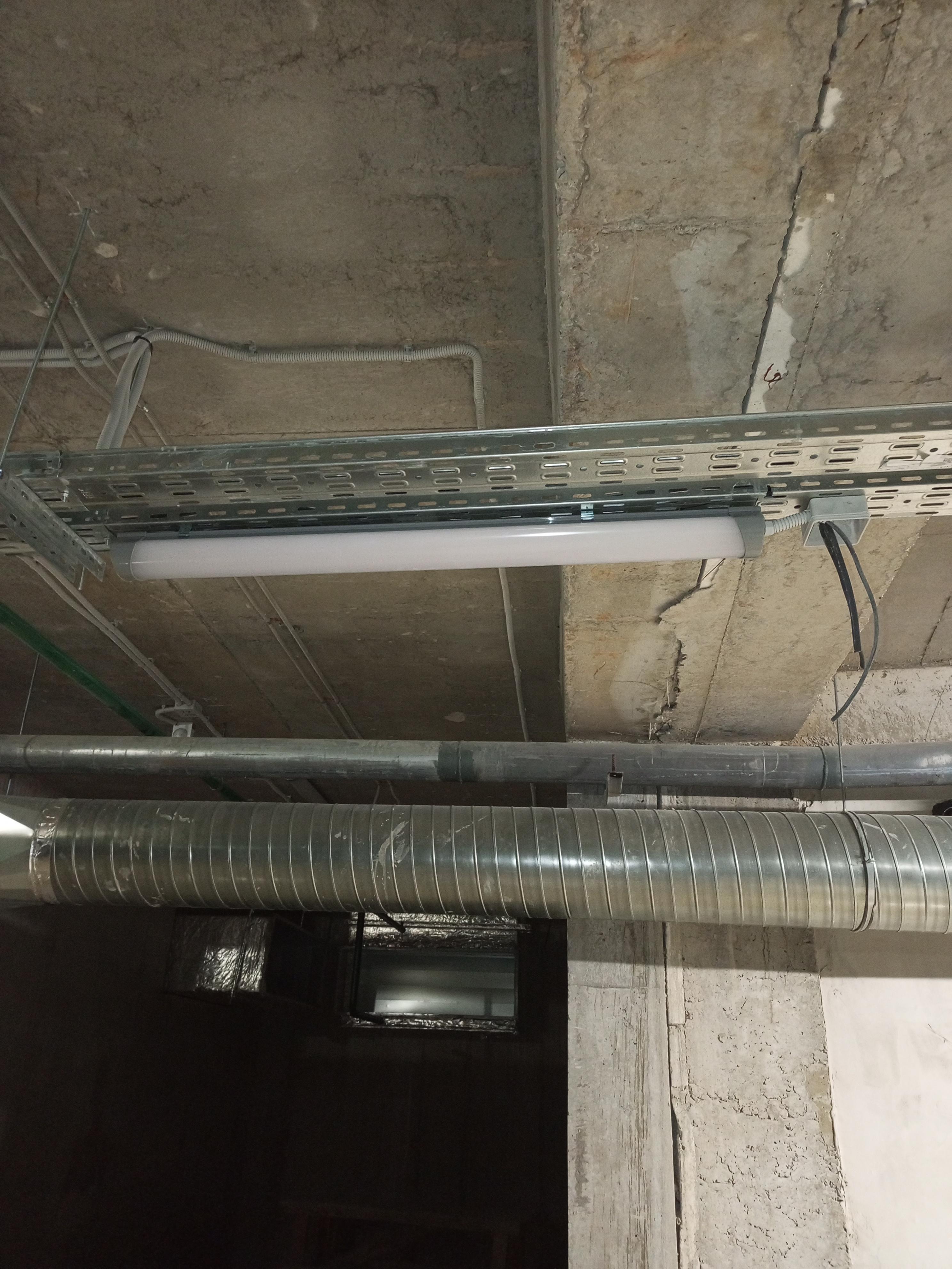 Дополнение от 28.12. Новороссийск, Мысхако - Монтаж светильников на подземной парковке ЖК " Резиденция Морей". Светодиодные изделия VARTON мощностью 50 Вт монтируются на металлический лоток и потолок.