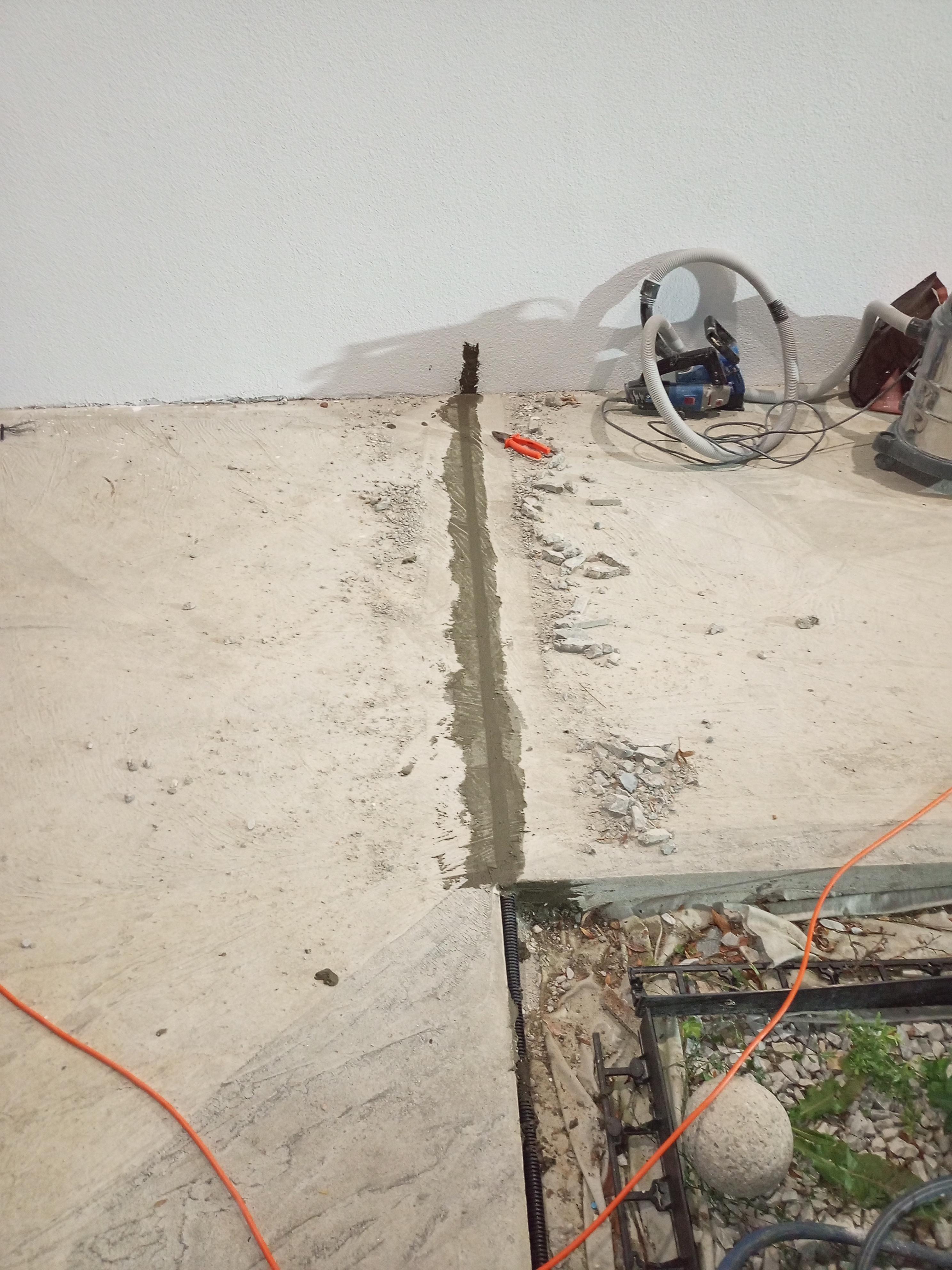 Определили место ввода кабеля от генератора в дом. Пришлось пробурить стену, штробить отмостку.