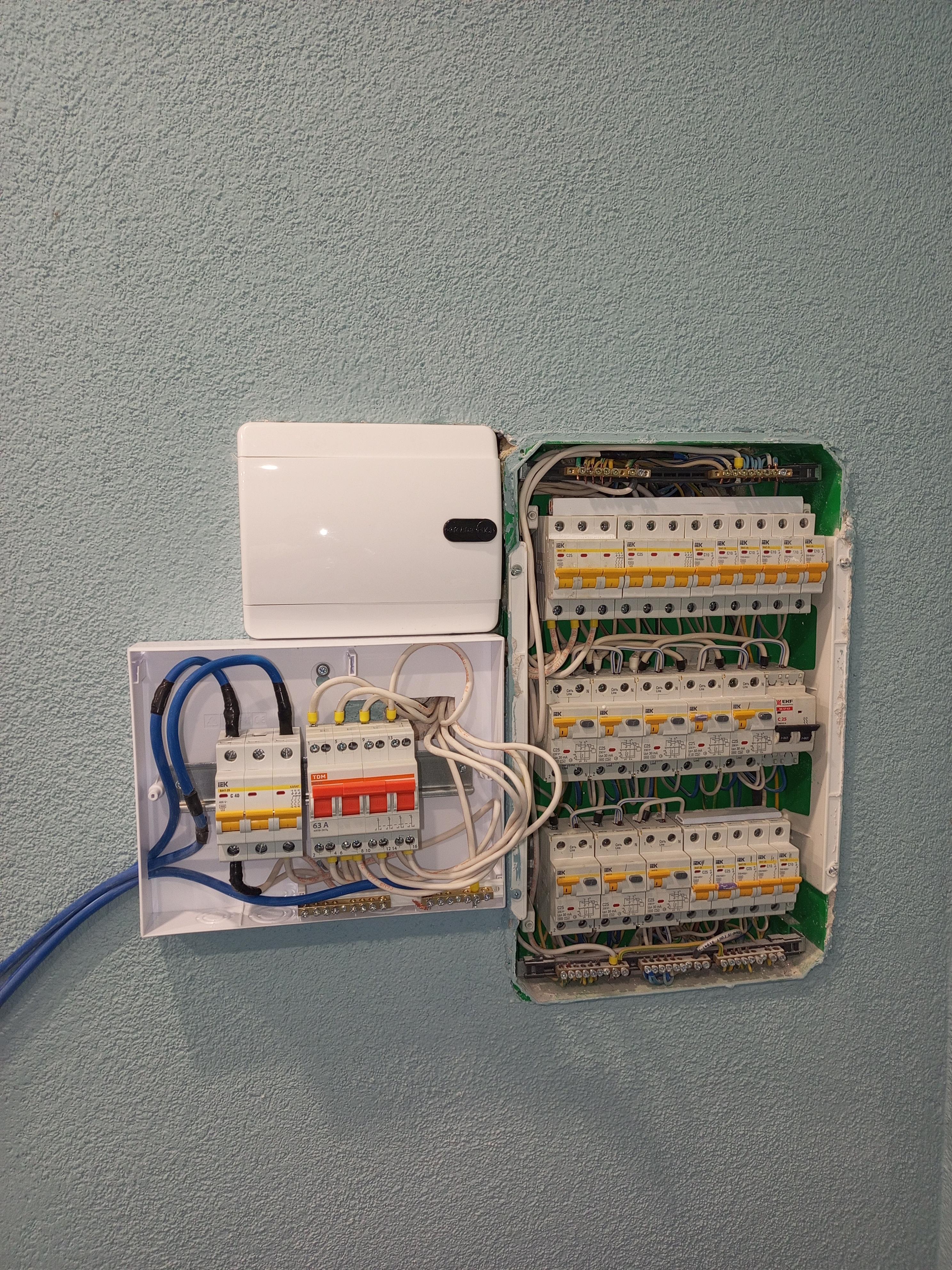 Дом относительно новый, но при проведении электромонтажных работ, не была предусмотрена возможность, подключения генератора, поэтому перед нами стояла задача - встроить однофазный генератор в трехфазную систему электроснабжения дома без использования автоматики АВР ( автоматическое включение резерва ).